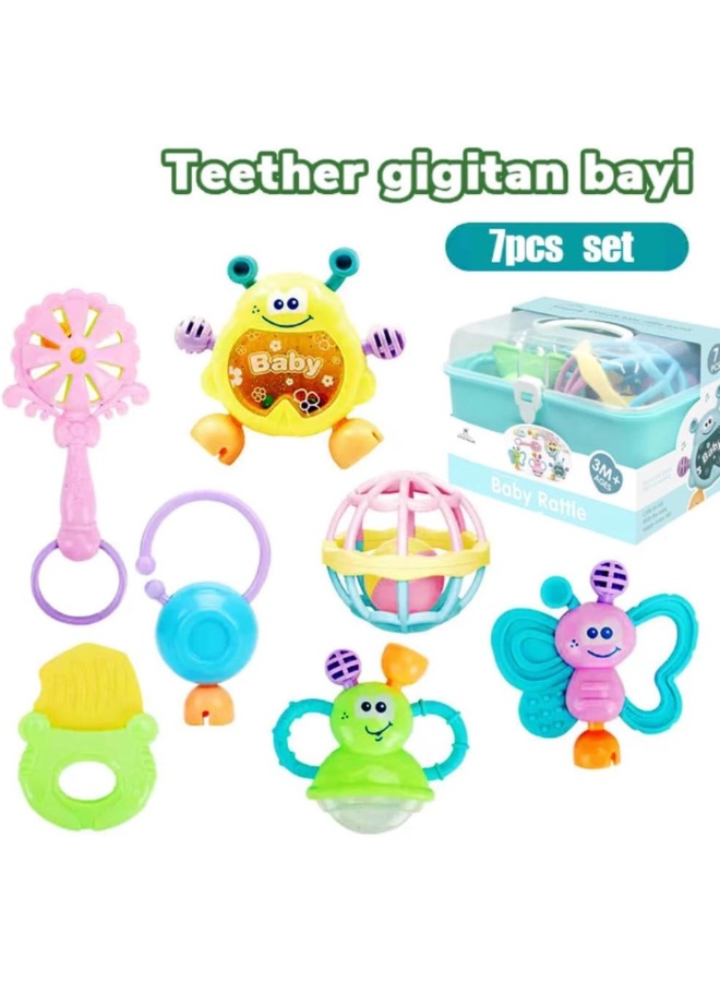– 7 قطع مختارة بعناية: يحتوي الصندوق على تشكيلة متنوعة من الشخاليل والمسكات وألعاب العضاضات، كل قطعة بتصميم فريد، ألوان زاهية، وأصوات لطيفة وممتعة لجذب انتباه الرضيع.