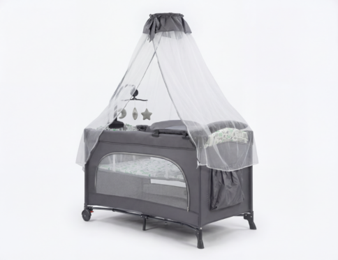 سرير أطفال متنقل دورين (Baby Travel Cot) قابل للطي مع ناموسية، فتحة جانبية بسوستة، ألعاب معلقة، وعجلات بفرامل - محبس للأطفال (kdd7)-light grey