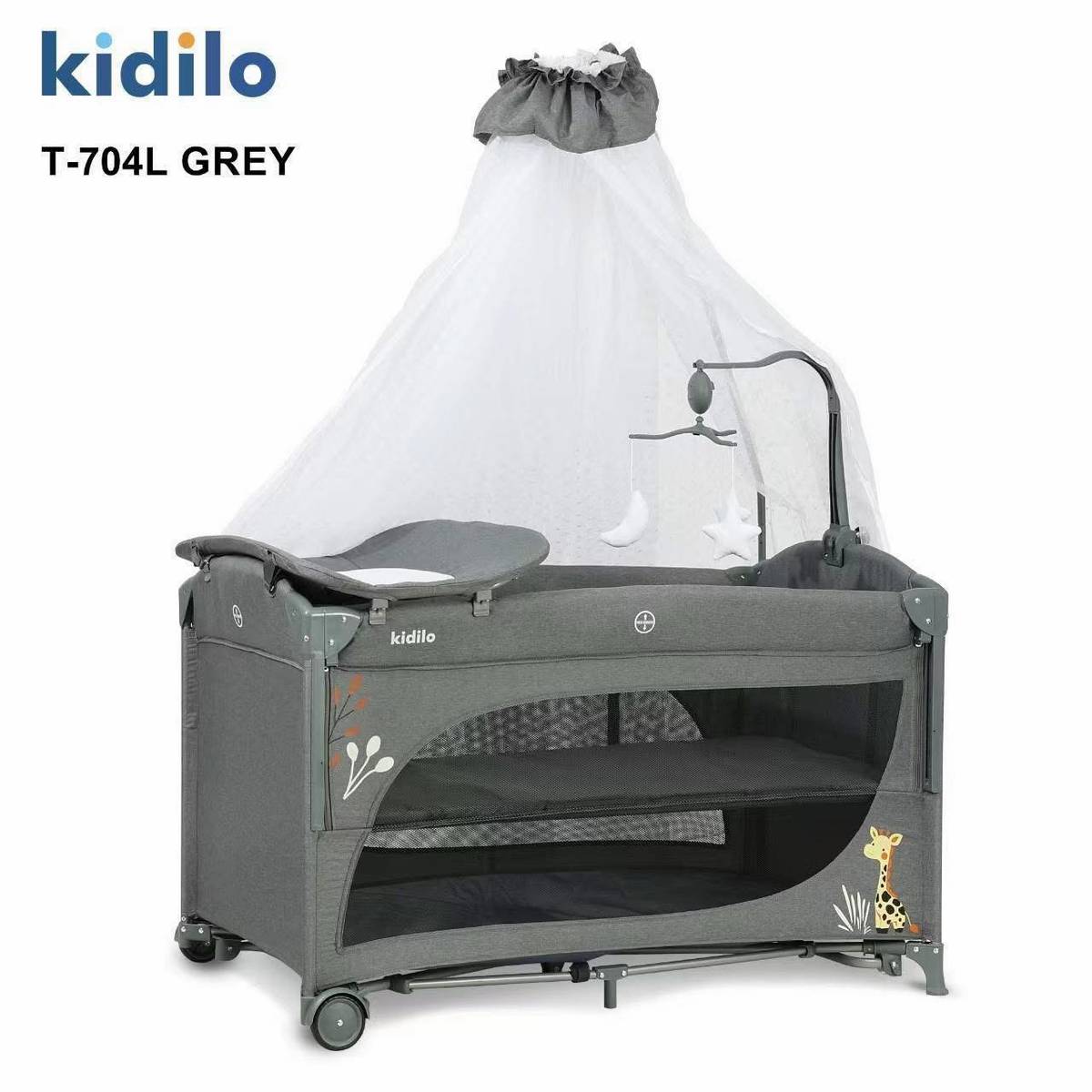 سرير أطفال دورين متنقل وهزاز مع ناموسية وطرابيزة غيار وعجل صامت – سرير جانبي للأم وقابل للطي t704 dark gray