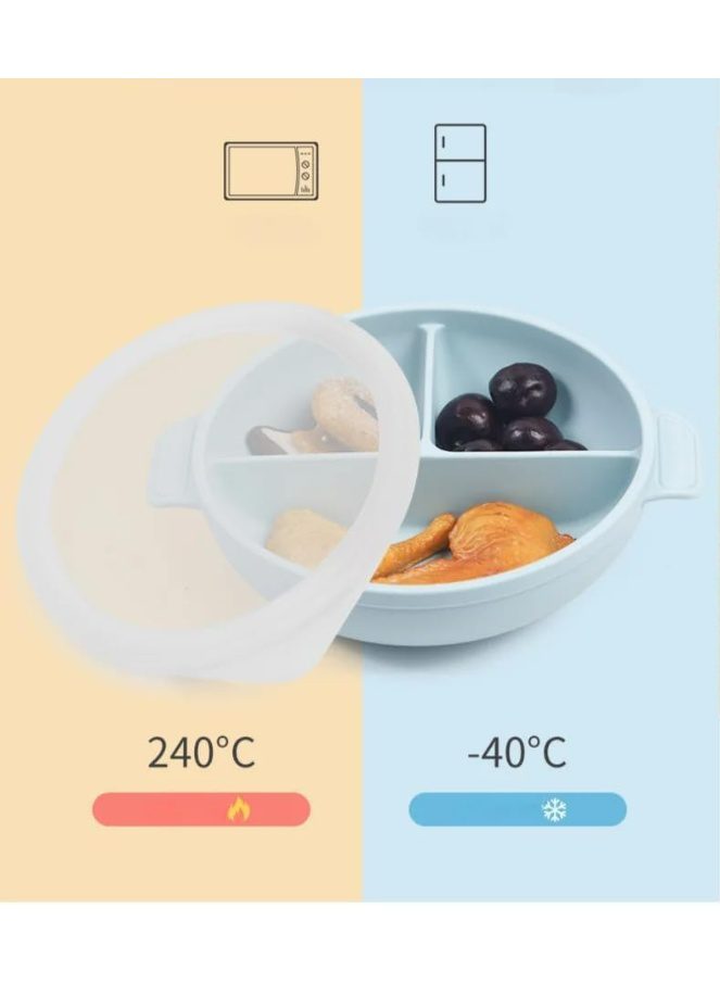 طقم تغذية سيليكون متكامل للأطفال المقسم واللاصق مع غطاء، شوكة، وملعقة – آمن للميكروويف والفريزر ومقاوم للحرارة العالية