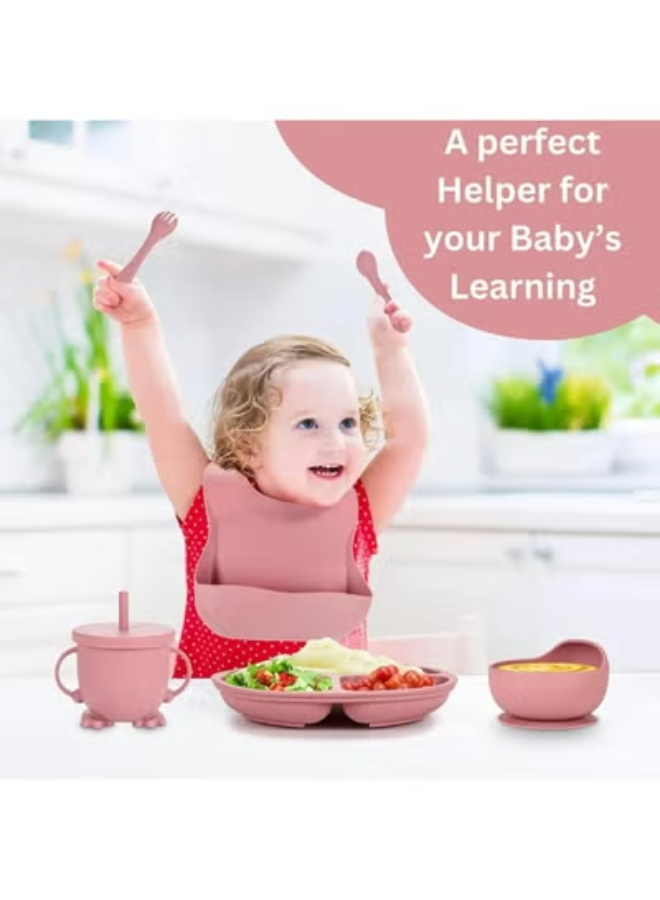 مجموعة ادوات تغذية الاطفال من السيليكون، لوازم الفطام، تتضمن اكواب شفط واطباق مقسمة ومريلة قابلة للتعديل وادوات اطفال وملاعق وشوك وكوب