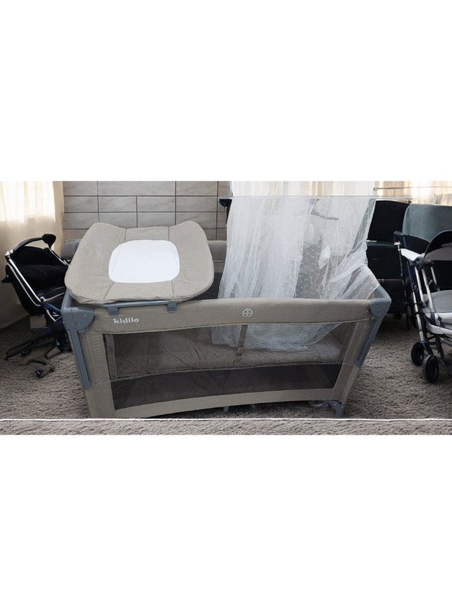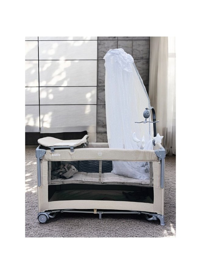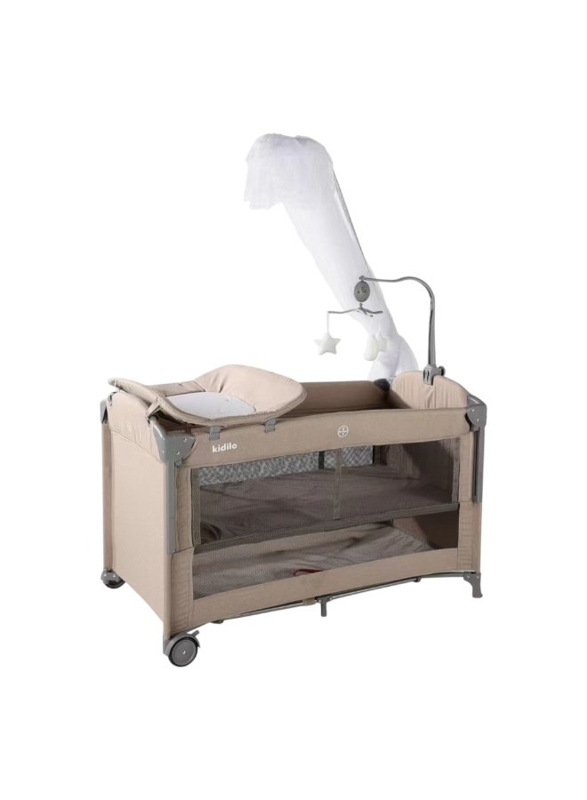 سرير أطفال متنقل دورين (Baby Travel Cot) قابل للطي مع ناموسية، فتحة جانبية بسوستة، ألعاب معلقة، وعجلات بفرامل - محبس للأطفال (kdd7)-khaki