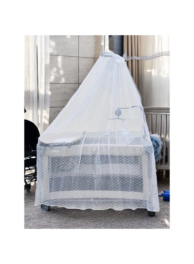 سرير اطفالKidilo متعدد الوظائف مستويين نوم، فتحة جانبية،طاولة غيار،هزاز،نموسية كبيرا جدا،العاب معلقة وموسيقي ،خزان لاغراض البيبي مرتبة.
